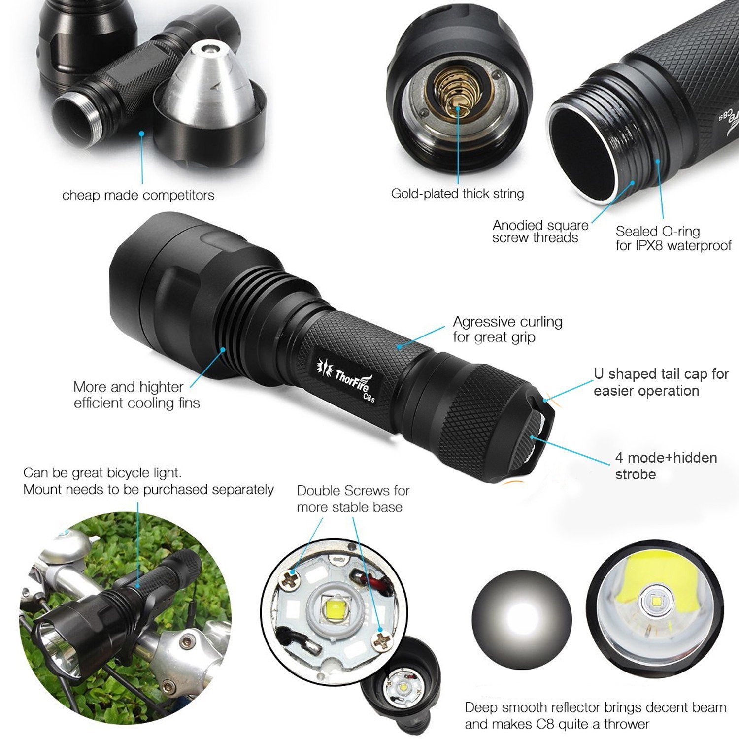 ThorFire C8s Flashlight ,900 Lumens , XML2 LED ,With Rechargeable 18650 Battery, USB Charger , Bike Light Mount