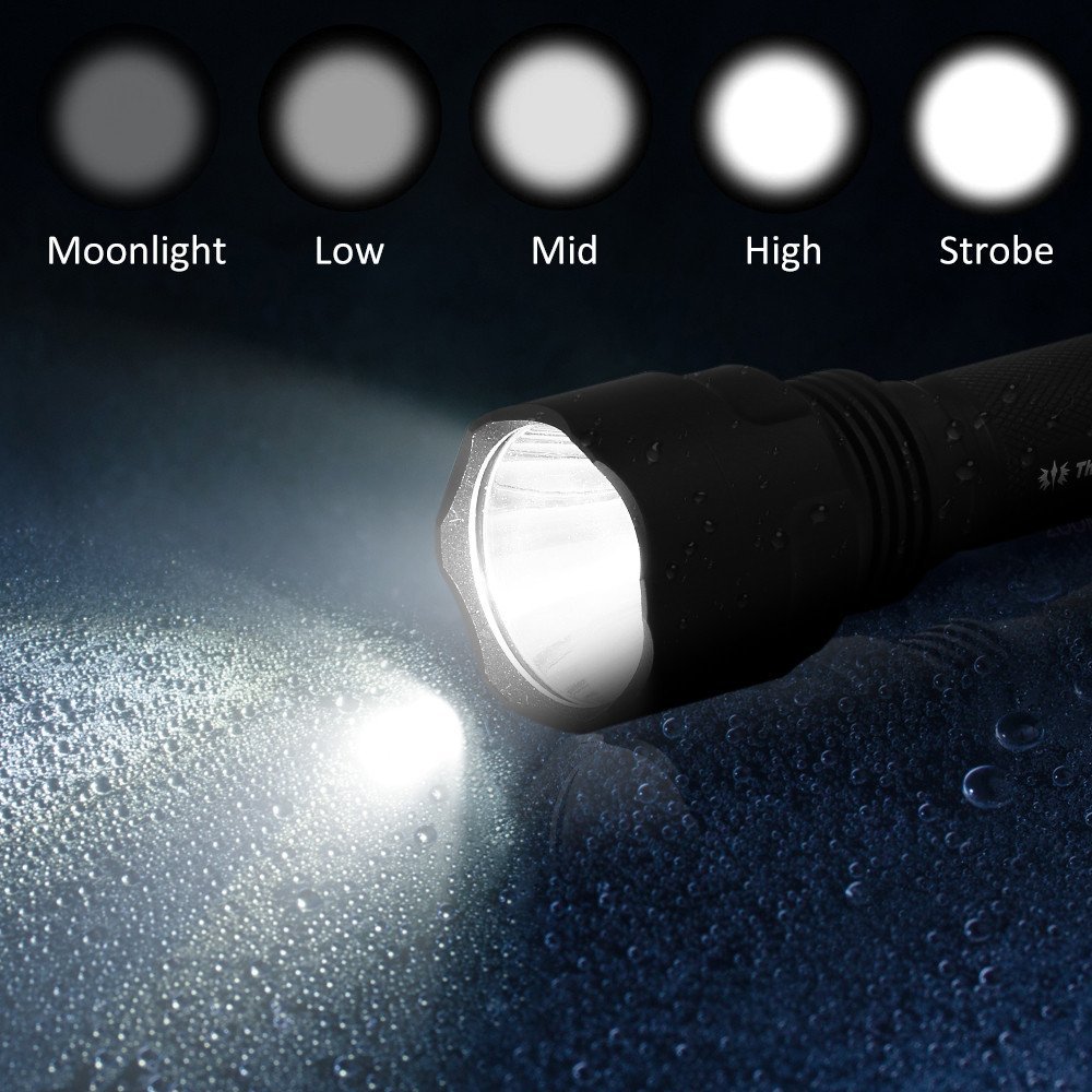 ThorFire C8s 5 modes: Moonlight/Low/Mid/High/Strobe. High(900LM)is really bright to outdoor activities or riding and range is about 600 meters. Low (30LM) and Mid(280LM)can be met the general daily use. Moonlight (0.5LM) is really low to protect your night vision, check babies, find keys, check machines etc.