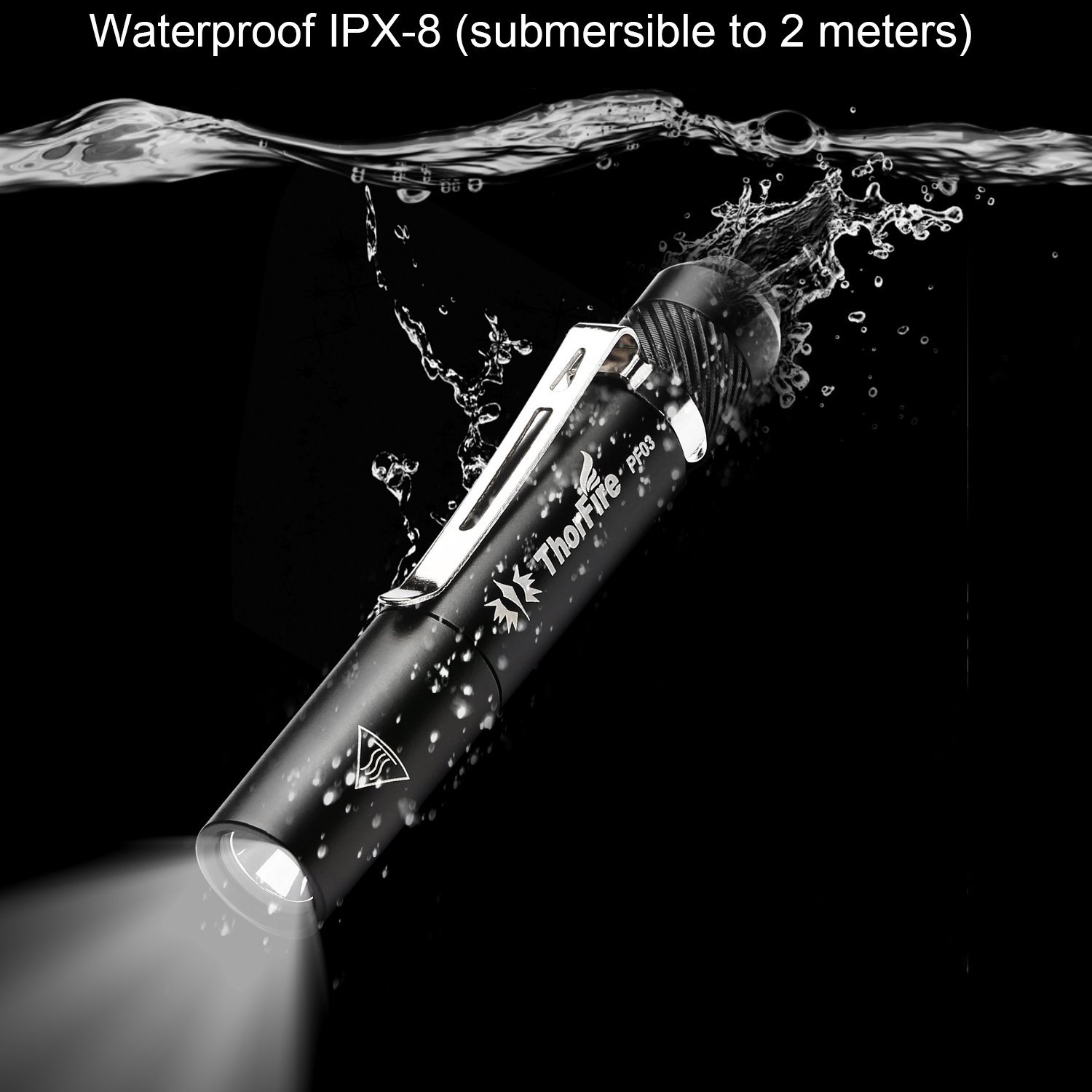 Since the clip has become the standard equipment of ThorFire PF flashlight series, the ThorFire PF03 flashlight is designed to have a customized clip as well. The dual functional clip allows you to clip the flashlight onto your suits pocket for an easy carry or simply turn the clip to its reversed direction and fix it onto your hat brim as a cap light.
